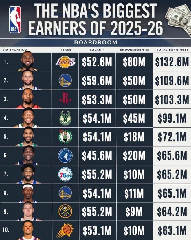 2025-26赛季,NBA收入最高的球员当中,詹姆斯的年薪高达5260万美元,商业收入8000万美元,总计1.326亿美元高居第一。库里年薪高达5960万美元,商业收入5000万美元,总计1.096亿美元,排名第二。杜兰特年薪高达5330万美元,商业收入5000万美元,总收入1.033亿美元,排名第三。